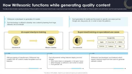 This slide provides information regarding functioning of Writesonic platform which has been trained through un-supervised and supervised methodology. It provides details how Writesonic platform works with minimum input from users to generate content. Slidegeeks is one of the best resources for PowerPoint templates. You can download easily and regulate How Writesonic Functions While Generating How Generative AI Tools Work AI SS V for your personal presentations from our wonderful collection. A few clicks is all it takes to discover and get the most relevant and appropriate templates. Use our Templates to add a unique zing and appeal to your presentation and meetings. All the slides are easy to edit and you can use them even for advertisement purposes. This slide provides information regarding functioning of Writesonic platform which has been trained through un-supervised and supervised methodology. It provides details how Writesonic platform works with minimum input from users to generate content.