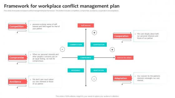 This slide showcases workplace conflict management plan framework. This further includes competition, compromise, avoidance, cooperation and adaptation. Pitch your topic with ease and precision using this Framework For Workplace Conflict Management Plan Slides Pdf. This layout presents information on Framework, Workplace Conflict Management Plan. It is also available for immediate download and adjustment. So, changes can be made in the color, design, graphics or any other component to create a unique layout. This slide showcases workplace conflict management plan framework. This further includes competition, compromise, avoidance, cooperation and adaptation.