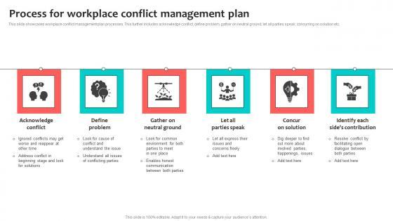 This slide showcases workplace conflict management plan processes. This further includes acknowledge conflict, define problem, gather on neutral ground, let all parties speak, concurring on solution etc. Showcasing this set of slides titled Process For Workplace Conflict Management Plan Professional Pdf. The topics addressed in these templates are Define Problem, Acknowledge Conflict, Concur On Solution. All the content presented in this PPT design is completely editable. Download it and make adjustments in color, background, font etc. as per your unique business setting. This slide showcases workplace conflict management plan processes. This further includes acknowledge conflict, define problem, gather on neutral ground, let all parties speak, concurring on solution etc.