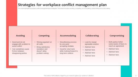 This slide highlights workplace conflict management plan strategies. This further includes avoiding, competing, accommodating, collaborating and compromising. Pitch your topic with ease and precision using this Strategies For Workplace Conflict Management Plan Microsoft Pdf. This layout presents information on Avoiding, Competing, Accommodating. It is also available for immediate download and adjustment. So, changes can be made in the color, design, graphics or any other component to create a unique layout. This slide highlights workplace conflict management plan strategies. This further includes avoiding, competing, accommodating, collaborating and compromising.