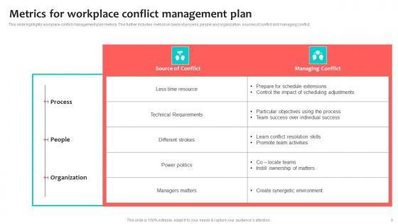 This slide highlights workplace conflict management plan metrics. This further includes metrics on basis of process, people and organization, sources of conflict and managing conflict. Showcasing this set of slides titled Metrics For Workplace Conflict Management Plan Topics Pdf. The topics addressed in these templates are Source Of Conflict, Technical Requirements, Managing Conflict. All the content presented in this PPT design is completely editable. Download it and make adjustments in color, background, font etc. as per your unique business setting. This slide highlights workplace conflict management plan metrics. This further includes metrics on basis of process, people and organization, sources of conflict and managing conflict.