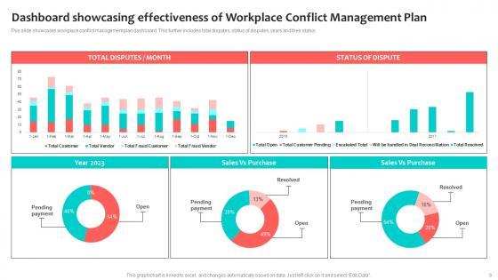 This slide showcases workplace conflict management plan dashboard. This further includes total disputes, status of disputes, years and their status Pitch your topic with ease and precision using this Dashboard Showcasing Effectiveness Of Workplace Conflict Management Plan Formats Pdf. This layout presents information on Dashboard Showcasing Effectiveness, Workplace Conflict Management Plan. It is also available for immediate download and adjustment. So, changes can be made in the color, design, graphics or any other component to create a unique layout. This slide showcases workplace conflict management plan dashboard. This further includes total disputes, status of disputes, years and their status