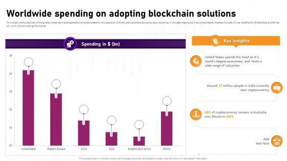 This slide covers overview of the global investment and expenditure trends related to the adoption of blockchain solutions across various industries. It includes regions such as United states, Western Europe, China, Asia Pacific, Middle East and Africa, etc. with US dominating the market. Retrieve professionally designed Worldwide Spending On Adopting Blockchain Complete Roadmap To Blockchain BCT SS V to effectively convey your message and captivate your listeners. Save time by selecting pre-made slideshows that are appropriate for various topics, from business to educational purposes. These themes come in many different styles, from creative to corporate, and all of them are easily adjustable and can be edited quickly. Access them as PowerPoint templates or as Google Slides themes. You do not have to go on a hunt for the perfect presentation because Slidegeeks got you covered from everywhere. This slide covers overview of the global investment and expenditure trends related to the adoption of blockchain solutions across various industries. It includes regions such as United states, Western Europe, China, Asia Pacific, Middle East and Africa, etc. with US dominating the market.