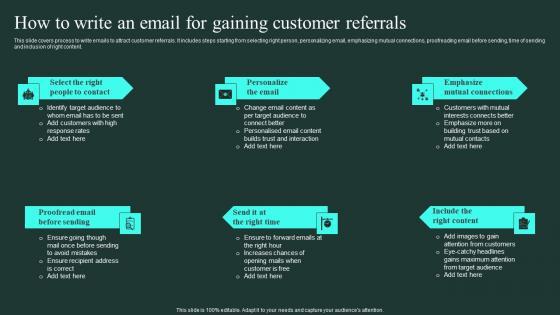 This slide covers process to write emails to attract customer referrals. It includes steps starting from selecting right person, personalizing email, emphasizing mutual connections, proofreading email before sending, time of sending and inclusion of right content.If you are looking for a format to display your unique thoughts, then the professionally designed How To Write An Email For Gaining Customer Referrals Word Of Mouth Marketing Information Pdf is the one for you. You can use it as a Google Slides template or a PowerPoint template. Incorporate impressive visuals, symbols, images, and other charts. Modify or reorganize the text boxes as you desire. Experiment with shade schemes and font pairings. Alter, share or cooperate with other people on your work. Download How To Write An Email For Gaining Customer Referrals Word Of Mouth Marketing Information Pdf and find out how to give a successful presentation. Present a perfect display to your team and make your presentation unforgettable. This slide covers process to write emails to attract customer referrals. It includes steps starting from selecting right person, personalizing email, emphasizing mutual connections, proofreading email before sending, time of sending and inclusion of right content.