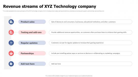 This slide represents the revenue streams of the XYZ Technology company which includes product sales, testing and add ons, extended warranties and support, partnerships, sponsorships, etc. Make sure to capture your audiences attention in your business displays with our gratis customizable Revenue Streams Of XYZ Technology Company Video Game Financing Pitch Deck. These are great for business strategies, office conferences, capital raising or task suggestions. If you desire to acquire more customers for your tech business and ensure they stay satisfied, create your own sales presentation with these plain slides. This slide represents the revenue streams of the XYZ Technology company which includes product sales, testing and add ons, extended warranties and support, partnerships, sponsorships, etc.