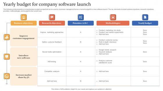 The following slide presents a comprehensive budget sample that can be used by business managers to frame a market budget for a new software launch. The key elements include business objectives, research objectives, priorities, methodologies, and budget for the current year.Showcasing this set of slides titled Yearly Budget For Company Software Launch Rules Pdf The topics addressed in these templates are Customer Engagement, Introduce New Software, Increase Market All the content presented in this PPT design is completely editable. Download it and make adjustments in color, background, font etc. as per your unique business setting. The following slide presents a comprehensive budget sample that can be used by business managers to frame a market budget for a new software launch. The key elements include business objectives, research objectives, priorities, methodologies, and budget for the current year.