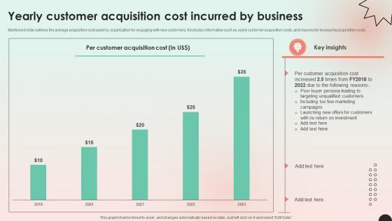 Mentioned slide outlines the average acquisition cost spent by organization for engaging with new customers. It includes information such as yearly customer acquisition costs, and reasons for increasing acquisition costs. Are you searching for a Web Consulting Business Yearly Customer Acquisition Cost Incurred By Business that is uncluttered, straightforward, and original Its easy to edit, and you can change the colors to suit your personal or business branding. For a presentation that expresses how much effort you have put in, this template is ideal With all of its features, including tables, diagrams, statistics, and lists, its perfect for a business plan presentation. Make your ideas more appealing with these professional slides. Download Web Consulting Business Yearly Customer Acquisition Cost Incurred By Business from Slidegeeks today. Mentioned slide outlines the average acquisition cost spent by organization for engaging with new customers. It includes information such as yearly customer acquisition costs, and reasons for increasing acquisition costs.