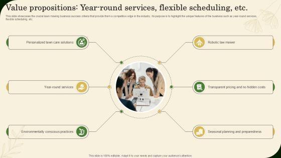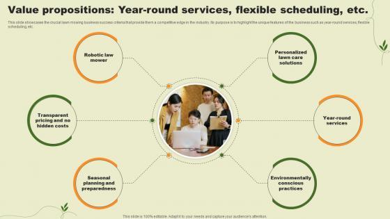 This slide showcases the crucial lawn mowing business success criteria that provide them a competitive edge in the industry. Its purpose is to highlight the unique features of the business such as year-round services, flexible scheduling, etc. There are so many reasons you need a Lawn Care Services Business Plan Value Propositions Year Round Services Flexible Scheduling BP SS V. The first reason is you can not spend time making everything from scratch, Thus, Slidegeeks has made presentation templates for you too. You can easily download these templates from our website easily. This slide showcases the crucial lawn mowing business success criteria that provide them a competitive edge in the industry. Its purpose is to highlight the unique features of the business such as year-round services, flexible scheduling, etc.