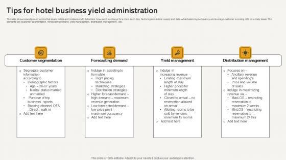 The slide showcases tips and tactics that assist hotels and restaurants to determine how much to charge for a room each day, factoring in real-time supply and data while balancing occupancy and average customer incoming rate on a daily basis. The elements are customer segmentation, forecasting demand, yield management, distribution management, etc. Showcasing this set of slides titled Tips For Hotel Business Yield Administration Icons Pdf The topics addressed in these templates are Customer Segmentation, Forecasting Demand, Yield Management All the content presented in this PPT design is completely editable. Download it and make adjustments in color, background, font etc. as per your unique business setting. The slide showcases tips and tactics that assist hotels and restaurants to determine how much to charge for a room each day, factoring in real-time supply and data while balancing occupancy and average customer incoming rate on a daily basis. The elements are customer segmentation, forecasting demand, yield management, distribution management, etc.