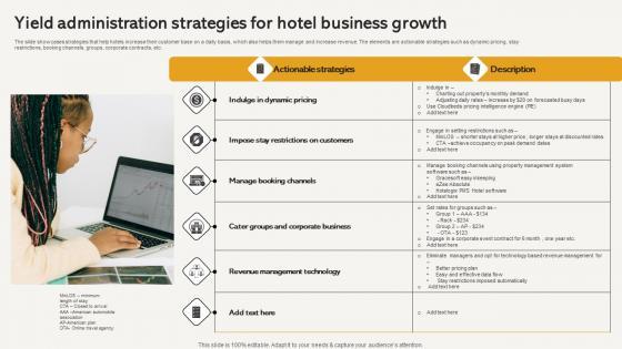 The slide showcases strategies that help hotels increase their customer base on a daily basis, which also helps them manage and increase revenue. The elements are actionable strategies such as dynamic pricing, stay restrictions, booking channels, groups, corporate contracts, etc. Pitch your topic with ease and precision using this Yield Administration Strategies For Hotel Business Growth Mockup Pdf This layout presents information on Restrictions On Customers, Manage Booking Channels, Revenue Management It is also available for immediate download and adjustment. So, changes can be made in the color, design, graphics or any other component to create a unique layout. The slide showcases strategies that help hotels increase their customer base on a daily basis, which also helps them manage and increase revenue. The elements are actionable strategies such as dynamic pricing, stay restrictions, booking channels, groups, corporate contracts, etc.