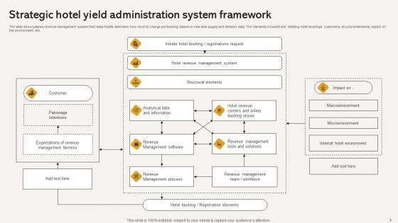 The slide showcases a revenue management system that helps hotels determine how much to charge per booking based on real-time supply and demand data. The elements included are initiating hotel bookings customers structural elements impact on the environment etc. Pitch your topic with ease and precision using this Strategic Hotel Yield Administration System Framework Template Pdf This layout presents information on Customer, Macroenvironment, Internal Hotel Environment It is also available for immediate download and adjustment. So, changes can be made in the color, design, graphics or any other component to create a unique layout. The slide showcases a revenue management system that helps hotels determine how much to charge per booking based on real-time supply and demand data. The elements included are initiating hotel bookings customers structural elements impact on the environment etc.
