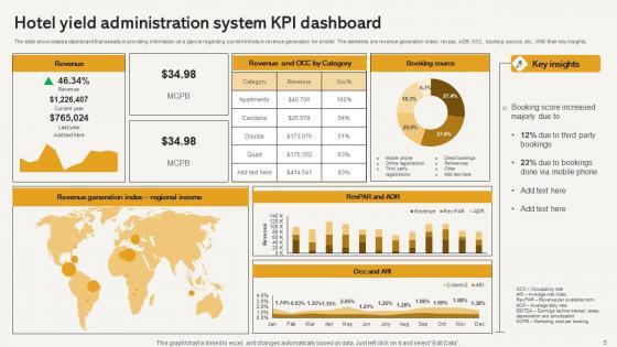 The slide showcases a dashboard that assists in providing information at a glance regarding current trends in revenue generation for a hotel. The elements are revenue generation index, revpar, ADR, OCC, booking source, etc., With their key insights. Pitch your topic with ease and precision using this Hotel Yield Administration System Kpi Dashboard Elements Pdf This layout presents information on Revenue, Booking Source, Regional Income, Key Insights It is also available for immediate download and adjustment. So, changes can be made in the color, design, graphics or any other component to create a unique layout. The slide showcases a dashboard that assists in providing information at a glance regarding current trends in revenue generation for a hotel. The elements are revenue generation index, revpar, ADR, OCC, booking source, etc., With their key insights.