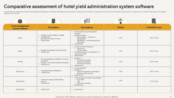 The slide shows management software that assists hotel managers in facilitating daily tasks and allowing them to operate more efficiently. The elements are software such as duetto, ideas, atomize, revpar guru, etc. With their descriptions, key features, ratings, and HT scores. Showcasing this set of slides titled Comparative Assessment Of Hotel Yield Administration System Software Elements Pdf The topics addressed in these templates are Management System Software, Key Features, Hoteltech Score All the content presented in this PPT design is completely editable. Download it and make adjustments in color, background, font etc. as per your unique business setting. The slide shows management software that assists hotel managers in facilitating daily tasks and allowing them to operate more efficiently. The elements are software such as duetto, ideas, atomize, revpar guru, etc. With their descriptions, key features, ratings, and HT scores.