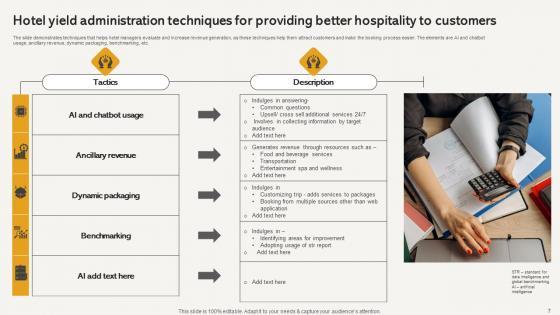 The slide demonstrates techniques that helps hotel managers evaluate and increase revenue generation, as these techniques help them attract customers and make the booking process easier. The elements are AI and chatbot usage, ancillary revenue, dynamic packaging, benchmarking, etc. Showcasing this set of slides titled Hotel Yield Administration Techniques For Providing Better Hospitality To Customers Sample Pdf The topics addressed in these templates are Ancillary Revenue, Dynamic Packaging, Benchmarking All the content presented in this PPT design is completely editable. Download it and make adjustments in color, background, font etc. as per your unique business setting. The slide demonstrates techniques that helps hotel managers evaluate and increase revenue generation, as these techniques help them attract customers and make the booking process easier. The elements are AI and chatbot usage, ancillary revenue, dynamic packaging, benchmarking, etc.