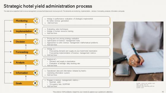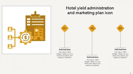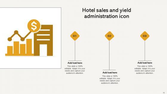 Improve your presentation delivery using this Hotel Yield Administratio Ppt Powerpoint Presentation Complete Deck With Slides Support your business vision and objectives using this well-structured PPT deck. This template offers a great starting point for delivering beautifully designed presentations on the topic of your choice. Comprising sixteen this professionally designed template is all you need to host discussion and meetings with collaborators. Each slide is self-explanatory and equipped with high-quality graphics that can be adjusted to your needs. Therefore, you will face no difficulty in portraying your desired content using this PPT slideshow. This PowerPoint slideshow contains every important element that you need for a great pitch. It is not only editable but also available for immediate download and utilization. The color, font size, background, shapes everything can be modified to create your unique presentation layout. Therefore, download it now. Our Hotel Yield Administratio Ppt Powerpoint Presentation Complete Deck With Slides are topically designed to provide an attractive backdrop to any subject. Use them to look like a presentation pro.