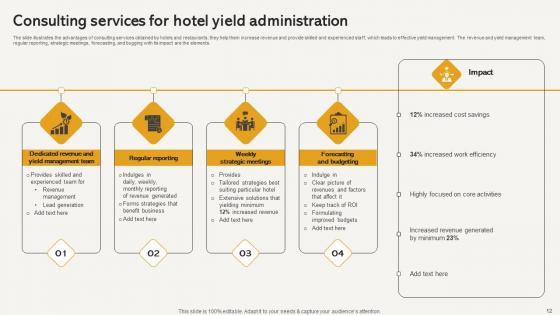 The slide illustrates the advantages of consulting services obtained by hotels and restaurants they help them increase revenue and provide skilled and experienced staff, which leads to effective yield management. The revenue and yield management team, regular reporting, strategic meetings, forecasting, and bugging with its impact are the elements. Pitch your topic with ease and precision using this Consulting Services For Hotel Yield Administration Diagrams Pdf This layout presents information on Regular Reporting, Weekly Strategic Meetings, Forecasting And Budgeting It is also available for immediate download and adjustment. So, changes can be made in the color, design, graphics or any other component to create a unique layout. The slide illustrates the advantages of consulting services obtained by hotels and restaurants they help them increase revenue and provide skilled and experienced staff, which leads to effective yield management. The revenue and yield management team, regular reporting, strategic meetings, forecasting, and bugging with its impact are the elements.