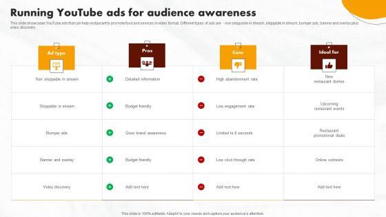 This slide showcases YouTube ads that can help restaurant to promote food and services in video format. Different types of ads are - non skippable in stream, skippable in stream, bumper ads, banner and overlay plus video discovery. Boost your pitch with our creative Strategic Promotional Guide For Restaurant Business Advertising Running Youtube Ads For Audience Awareness Slides PDF. Deliver an awe-inspiring pitch that will mesmerize everyone. Using these presentation templates you will surely catch everyones attention. You can browse the ppts collection on our website. We have researchers who are experts at creating the right content for the templates. So you don not have to invest time in any additional work. Just grab the template now and use them.