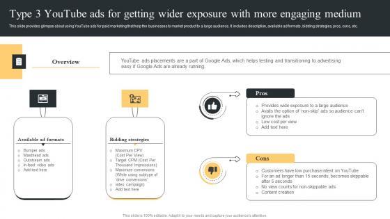 This slide provides glimpse about using YouTube ads for paid marketing that help the businesses to market product to a large audience. It includes description, available ad formats, bidding strategies, pros, cons, etc. Do you know about Slidesgeeks Type 3 Youtube Ads For Getting Wider Exposure With More Engaging Medium Template Pdf These are perfect for delivering any kind od presentation. Using it, create PowerPoint presentations that communicate your ideas and engage audiences. Save time and effort by using our pre designed presentation templates that are perfect for a wide range of topic. Our vast selection of designs covers a range of styles, from creative to business, and are all highly customizable and easy to edit. Download as a PowerPoint template or use them as Google Slides themes. This slide provides glimpse about using YouTube ads for paid marketing that help the businesses to market product to a large audience. It includes description, available ad formats, bidding strategies, pros, cons, etc.