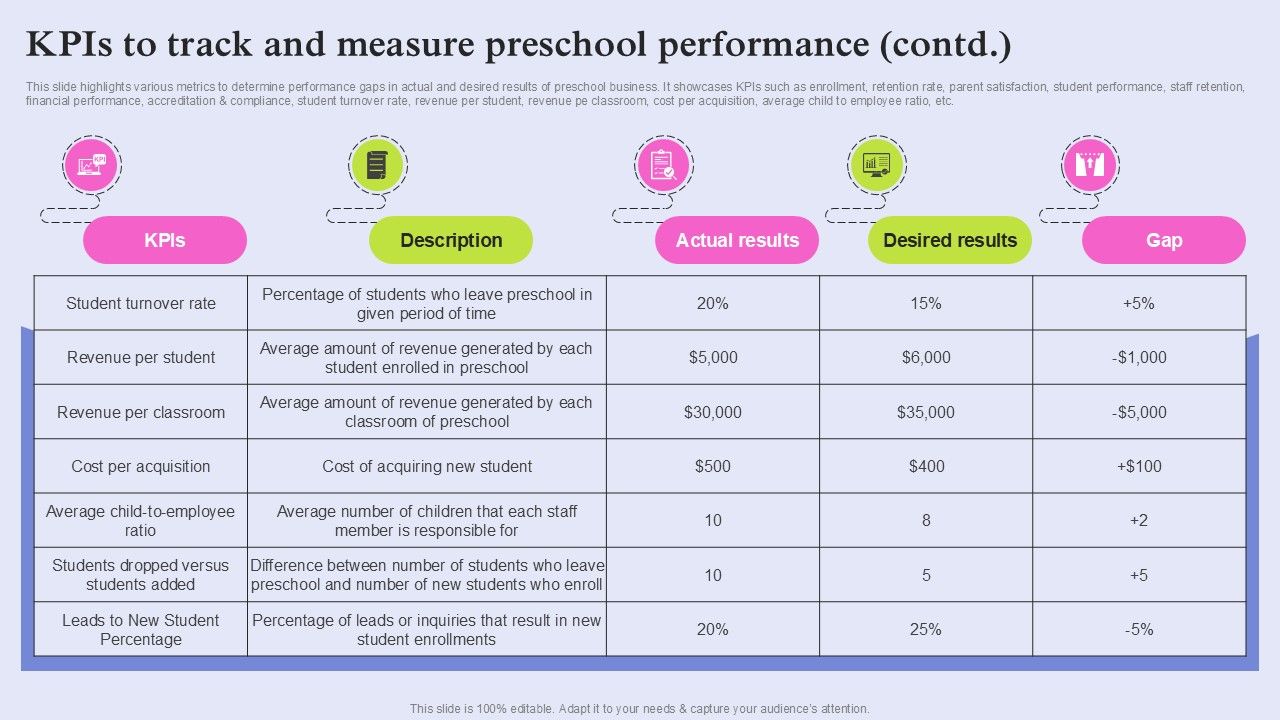 This slide highlights various metrics to determine performance gaps in actual and desired results of preschool business. It showcases KPIs such as enrollment, retention rate, parent satisfaction, student performance, staff retention, accreditation and compliance, student turnover rate, revenue per student, revenue pe classroom, cost per acquisition, average child to employee ratio, etc. Coming up with a presentation necessitates that the majority of the effort goes into the content and the message you intend to convey. The visuals of a PowerPoint presentation can only be effective if it supplements and supports the story that is being told. Keeping this in mind our experts created Pre School Marketing Strategy To Enhance Enrollment Rate Kpis To Track And Measure Preschool Diagrams PDF to reduce the time that goes into designing the presentation. This way, you can concentrate on the message while our designers take care of providing you with the right template for the situation.