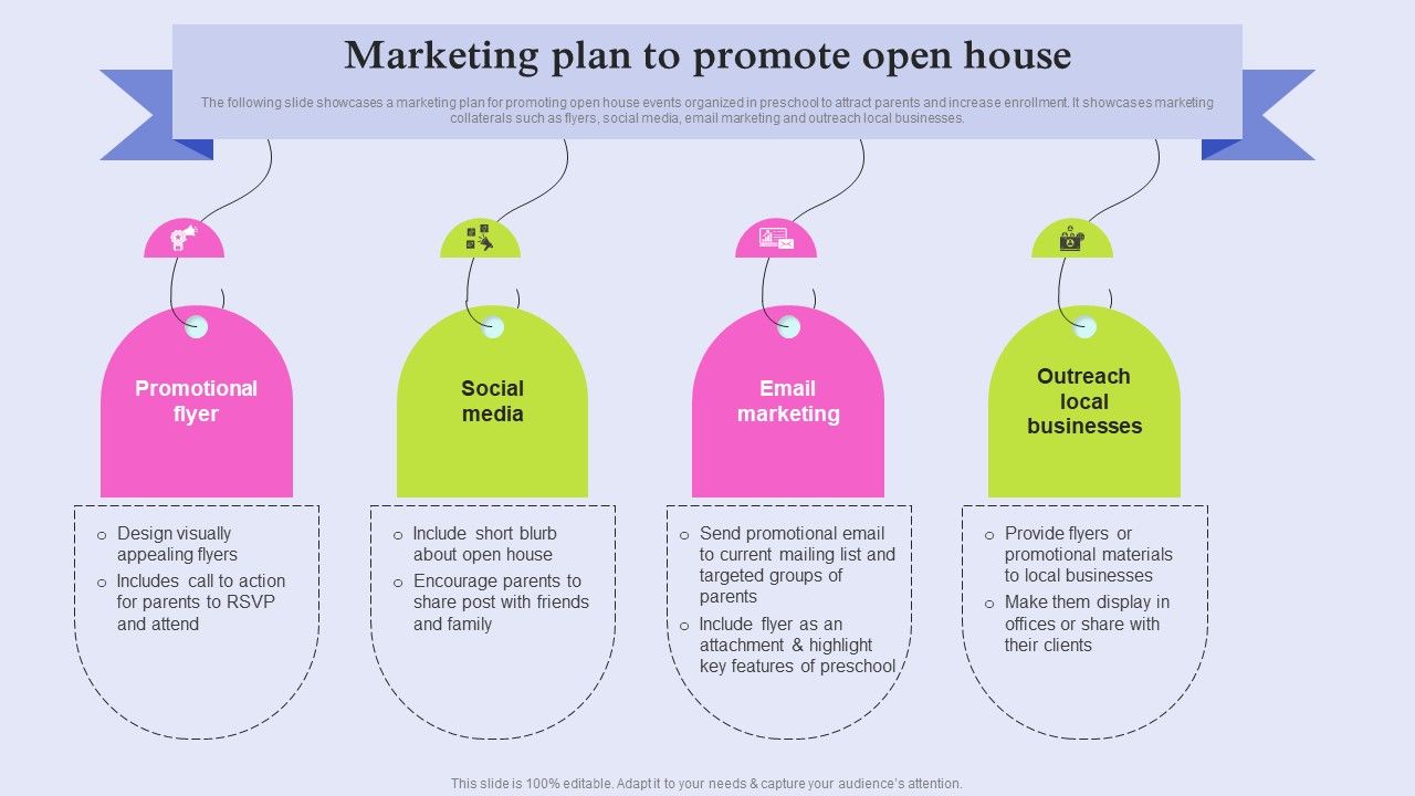 The following slide showcases a marketing plan for promoting open house events organized in preschool to attract parents and increase enrollment. It showcases marketing collaterals such as flyers, social media, email marketing and outreach local businesses. This modern and well arranged Pre School Marketing Strategy To Enhance Enrollment Rate Marketing Plan To Promote Summary PDF provides lots of creative possibilities. It is very simple to customize and edit with the Powerpoint Software. Just drag and drop your pictures into the shapes. All facets of this template can be edited with Powerpoint no extra software is necessary. Add your own material, put your images in the places assigned for them, adjust the colors, and then you can show your slides to the world, with an animated slide included.