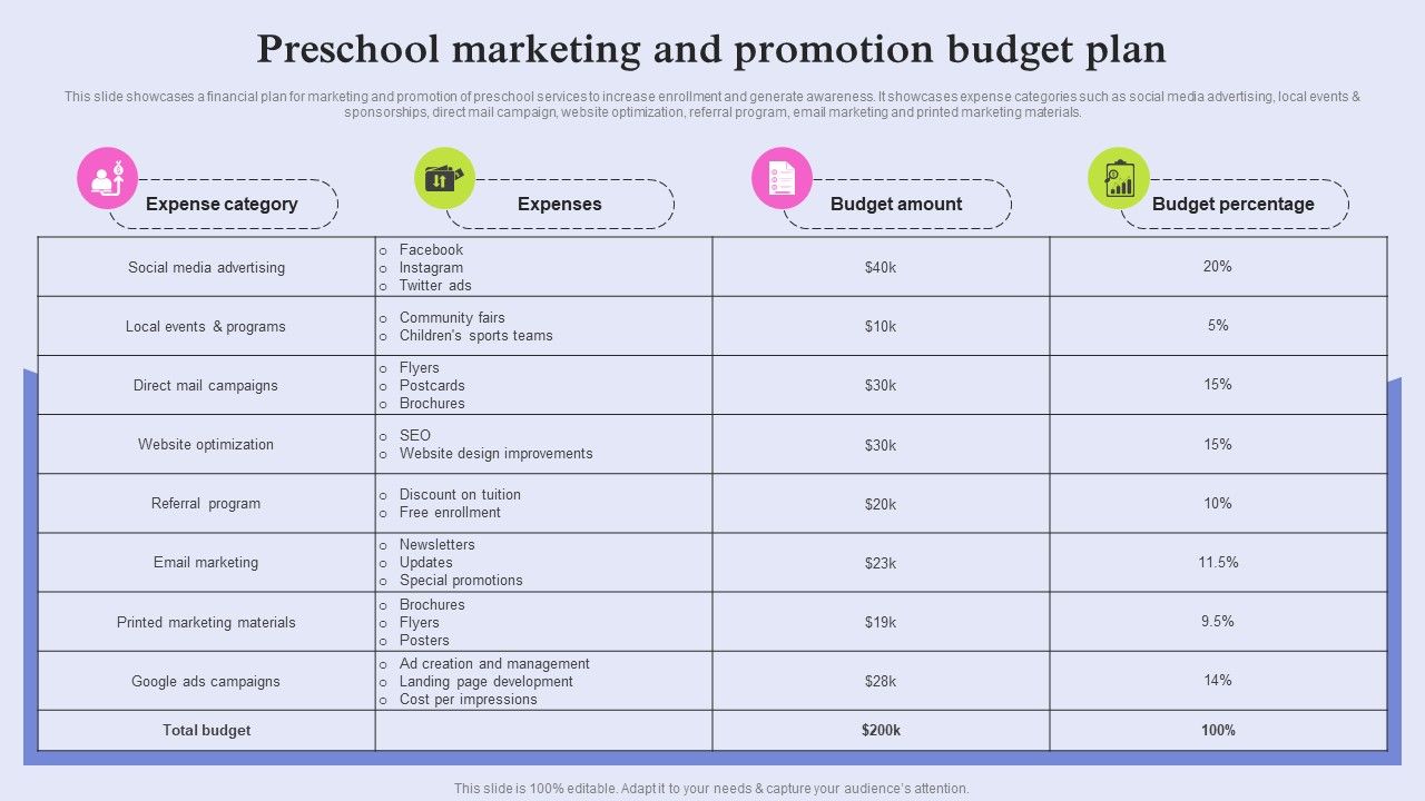 This slide showcases a financial plan for marketing and promotion of preschool services to increase enrollment and generate awareness. It showcases expense categories such as social media advertising, local events and sponsorships, direct mail campaign, website optimization, referral program, email marketing and printed marketing materials. This Pre School Marketing Strategy To Enhance Enrollment Rate Preschool Marketing And Promotion Rules PDF is perfect for any presentation, be it in front of clients or colleagues. It is a versatile and stylish solution for organizing your meetings. The product features a modern design for your presentation meetings. The adjustable and customizable slides provide unlimited possibilities for acing up your presentation. Slidegeeks has done all the homework before launching the product for you. So, do not wait, grab the presentation templates today