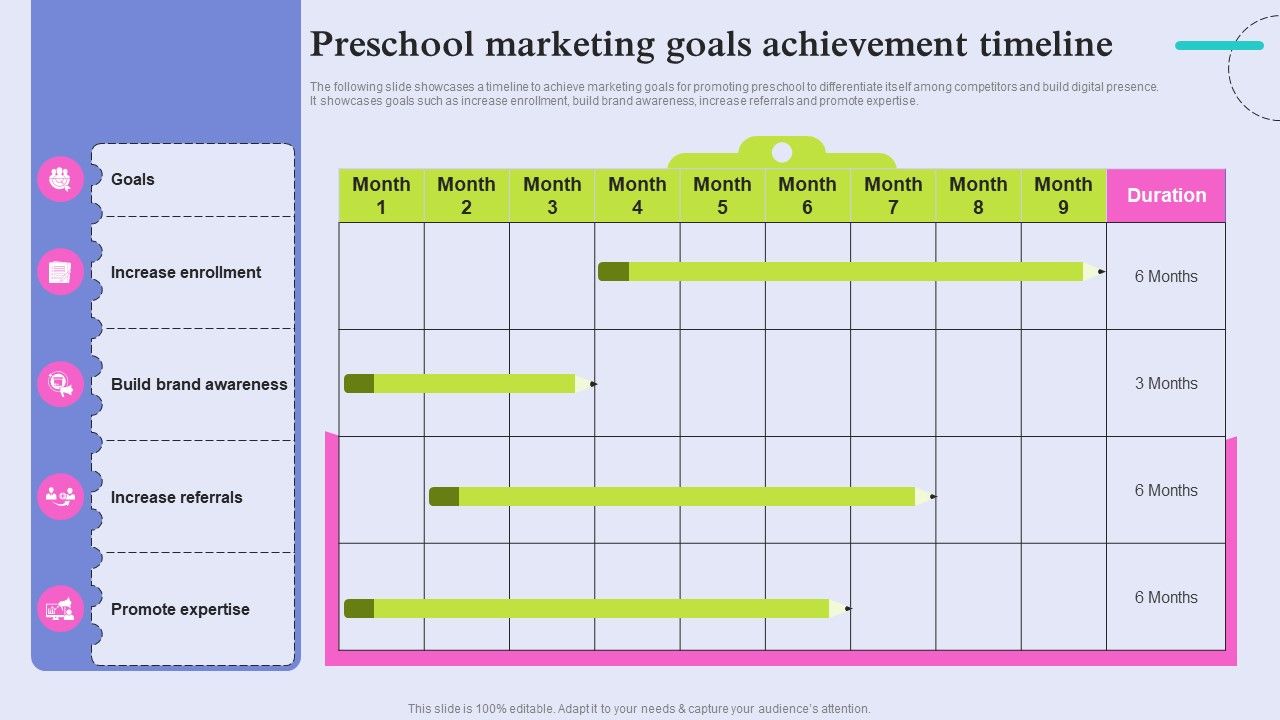 The following slide showcases a timeline to achieve marketing goals for promoting preschool to differentiate itself among competitors and build digital presence. It showcases goals such as increase enrollment, build brand awareness, increase referrals and promote expertise. Welcome to our selection of the Pre School Marketing Strategy To Enhance Enrollment Rate Preschool Marketing Goals Brochure PDF. These are designed to help you showcase your creativity and bring your sphere to life. Planning and Innovation are essential for any business that is just starting out. This collection contains the designs that you need for your everyday presentations. All of our PowerPoints are 100 percent editable, so you can customize them to suit your needs. This multi purpose template can be used in various situations. Grab these presentation templates today.