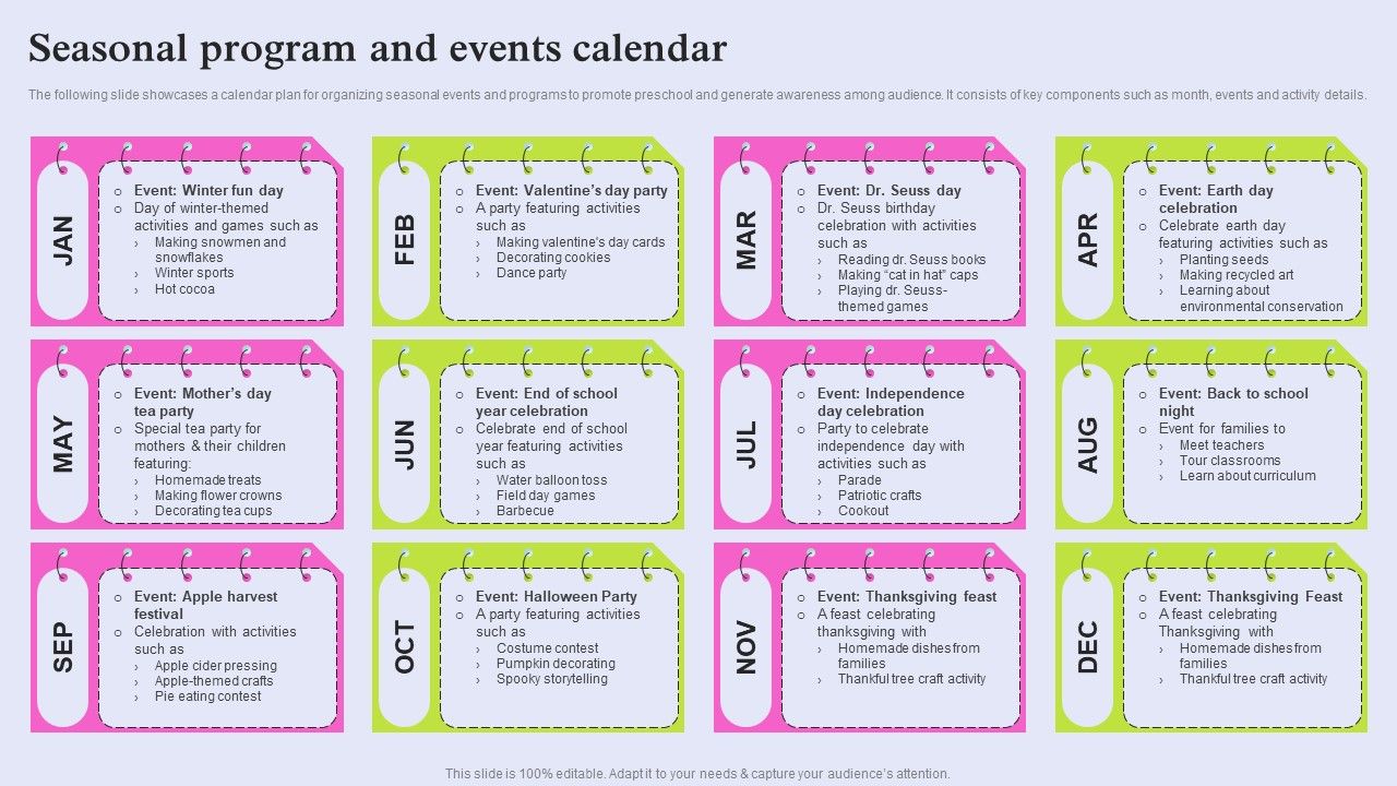 Pre School Marketing Strategy To Enhance Enrollment Rate Seasonal Program And Events Calendar Infographics PDF with all 9 slides: