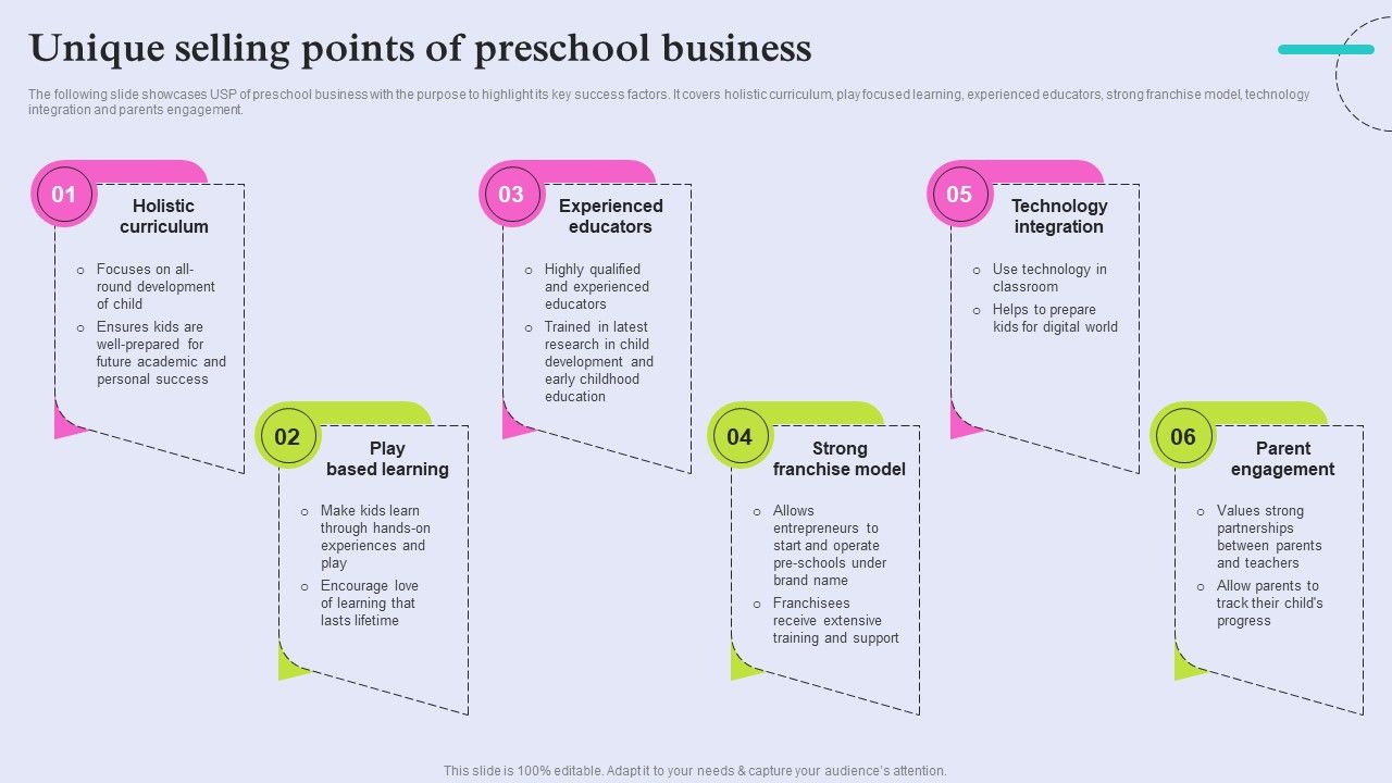 The following slide showcases USP of preschool business with the purpose to highlight its key success factors. It covers holistic curriculum, play focused learning, experienced educators, strong franchise model, technology integration and parents engagement. Do you know about Slidesgeeks Pre School Marketing Strategy To Enhance Enrollment Rate Unique Selling Points Of Preschool Business Demonstration PDF These are perfect for delivering any kind od presentation. Using it, create PowerPoint presentations that communicate your ideas and engage audiences. Save time and effort by using our pre designed presentation templates that are perfect for a wide range of topic. Our vast selection of designs covers a range of styles, from creative to business, and are all highly customizable and easy to edit. Download as a PowerPoint template or use them as Google Slides themes.