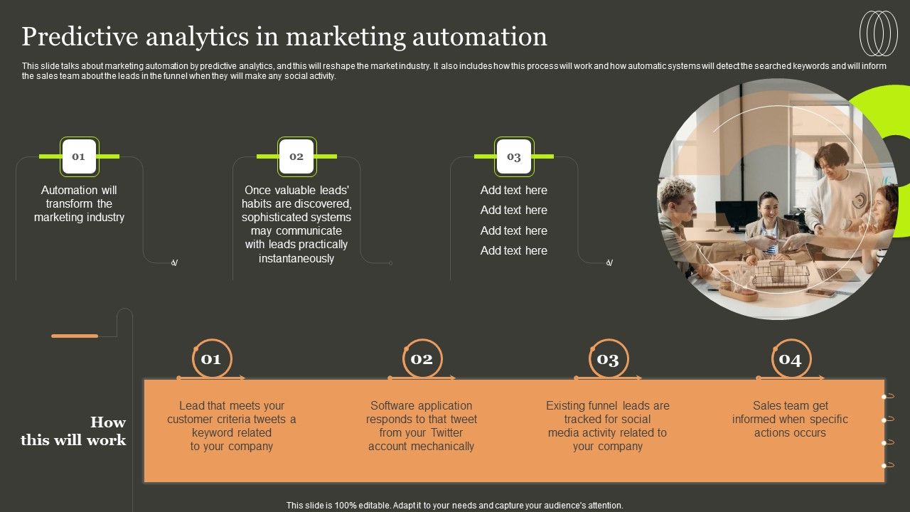 This slide talks about marketing automation by predictive analytics, and this will reshape the market industry. It also includes how this process will work and how automatic systems will detect the searched keywords and will inform the sales team about the leads in the funnel when they will make any social activity. Welcome to our selection of the Predictive Analytics Methods Predictive Analytics In Marketing Automation Topics PDF. These are designed to help you showcase your creativity and bring your sphere to life. Planning and Innovation are essential for any business that is just starting out. This collection contains the designs that you need for your everyday presentations. All of our PowerPoints are 100 percent editable, so you can customize them to suit your needs. This multi purpose template can be used in various situations. Grab these presentation templates today.