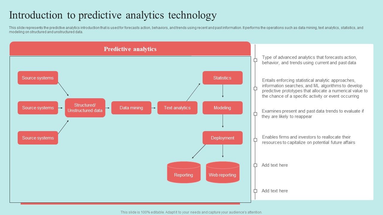This slide represents the predictive analytics introduction that is used for forecasts action, behaviors, and trends using recent and past information. It performs the operations such as data mining, text analytics, statistics, and modeling on structured and unstructured data. Find highly impressive Predictive Data Model Introduction To Predictive Analytics Technology Introduction PDF on Slidegeeks to deliver a meaningful presentation. You can save an ample amount of time using these presentation templates. No need to worry to prepare everything from scratch because Slidegeeks experts have already done a huge research and work for you. You need to download Predictive Data Model Introduction To Predictive Analytics Technology Introduction PDF for your upcoming presentation. All the presentation templates are 100 percent editable and you can change the color and personalize the content accordingly. Download now