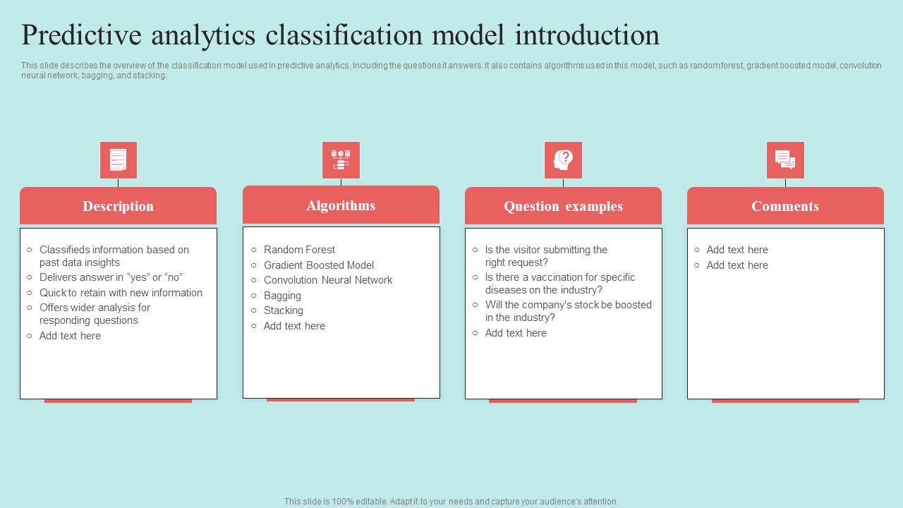 This slide describes the overview of the classification model used in predictive analytics, including the questions it answers. It also contains algorithms used in this model, such as random forest, gradient boosted model, convolution neural network, bagging, and stacking. This Predictive Data Model Predictive Analytics Classification Model Introduction Formats PDF is perfect for any presentation, be it in front of clients or colleagues. It is a versatile and stylish solution for organizing your meetings. The Predictive Data Model Predictive Analytics Classification Model Introduction Formats PDF features a modern design for your presentation meetings. The adjustable and customizable slides provide unlimited possibilities for acing up your presentation. Slidegeeks has done all the homework before launching the product for you. So, do not wait, grab the presentation templates today