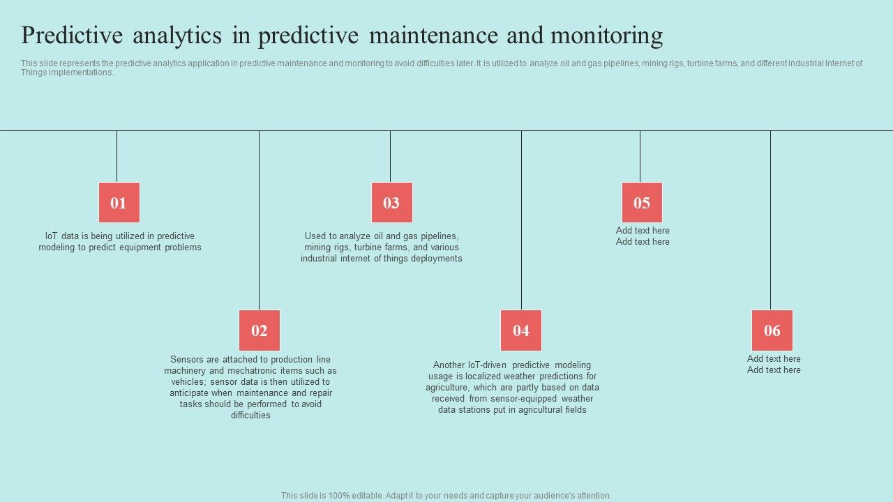 This slide represents the predictive analytics application in predictive maintenance and monitoring to avoid difficulties later. It is utilized to analyze oil and gas pipelines, mining rigs, turbine farms, and different industrial Internet of Things implementations. Take your projects to the next level with our ultimate collection of Predictive Data Model Predictive Analytics In Predictive Maintenance And Monitoring Brochure PDF. Slidegeeks has designed a range of layouts that are perfect for representing task or activity duration, keeping track of all your deadlines at a glance. Tailor these designs to your exact needs and give them a truly corporate look with your own brand colors they will make your projects stand out from the rest