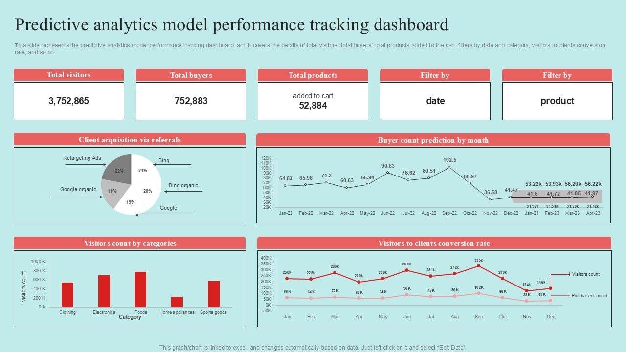 This slide represents the predictive analytics model performance tracking dashboard, and it covers the details of total visitors, total buyers, total products added to the cart, filters by date and category, visitors to clients conversion rate, and so on. Find a pre-designed and impeccable Predictive Data Model Predictive Analytics Model Performance Tracking Dashboard Themes PDF. The templates can ace your presentation without additional effort. You can download these easy-to-edit presentation templates to make your presentation stand out from others. So, what are you waiting for Download the template from Slidegeeks today and give a unique touch to your presentation.