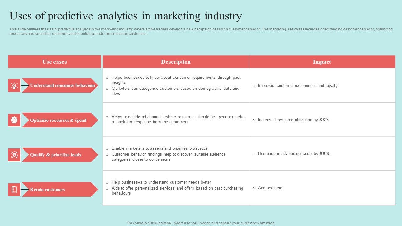 This slide outlines the use of predictive analytics in the marketing industry, where active traders develop a new campaign based on customer behavior. The marketing use cases include understanding customer behavior, optimizing resources and spending, qualifying and prioritizing leads, and retaining customers. Are you in need of a template that can accommodate all of your creative concepts This one is crafted professionally and can be altered to fit any style. Use it with Google Slides or PowerPoint. Include striking photographs, symbols, depictions, and other visuals. Fill, move around, or remove text boxes as desired. Test out color palettes and font mixtures. Edit and save your work, or work with colleagues. Download Predictive Data Model Uses Of Predictive Analytics In Marketing Industry Themes PDF and observe how to make your presentation outstanding. Give an impeccable presentation to your group and make your presentation unforgettable.