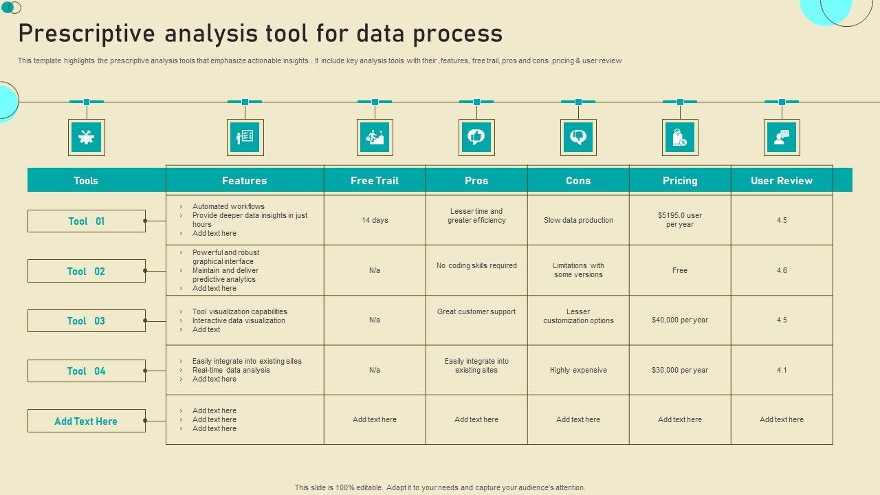 This template highlights the prescriptive analysis tools that emphasize actionable insights . It include key analysis tools with their ,features, free trail, pros and cons ,pricing and user review. Pitch your topic with ease and precision using this Prescriptive Analysis Tool For Data Process Information PDF. This layout presents information on Data Visualization, Visualization Capabilities, Automated Workflows. It is also available for immediate download and adjustment. So, changes can be made in the color, design, graphics or any other component to create a unique layout.