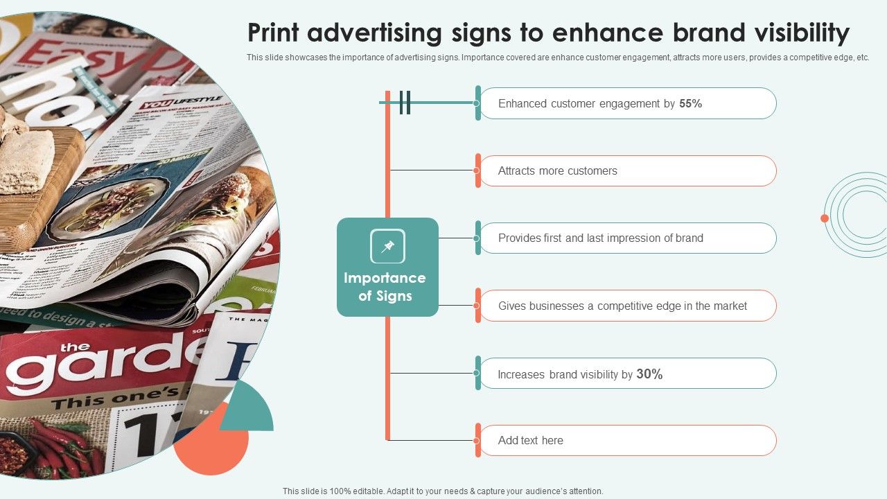 This slide showcases the importance of advertising signs. Importance covered are enhance customer engagement, attracts more users, provides a competitive edge, etc. This modern and well arranged Print Advertising Signs To Enhance Brand Visibility Ppt Outline Smartart PDF provides lots of creative possibilities. It is very simple to customize and edit with the Powerpoint Software. Just drag and drop your pictures into the shapes. All facets of this template can be edited with Powerpoint no extra software is necessary. Add your own material, put your images in the places assigned for them, adjust the colors, and then you can show your slides to the world, with an animated slide included.