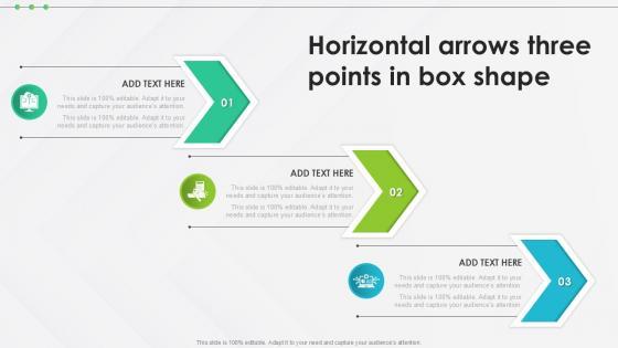 Boost your pitch with our creative Horizontal Arrows Three Points In Box Shape. Deliver an awe-inspiring pitch that will mesmerize everyone. Using these presentation templates you will surely catch everyones attention. You can browse the ppts collection on our website. We have researchers who are experts at creating the right content for the templates. So you do not have to invest time in any additional work. Just grab the template now and use them.
