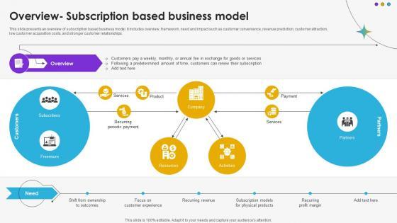 This slide presents an overview of subscription based business model. It includes overview, framework, need and impact such as customer convenience, revenue prediction, customer attraction, low customer acquisition costs, and stronger customer relationships.Take your projects to the next level with our ultimate collection of Overview Subscription Based Business Model DT SS V. Slidegeeks has designed a range of layouts that are perfect for representing task or activity duration, keeping track of all your deadlines at a glance. Tailor these designs to your exact needs and give them a truly corporate look with your own brand colors they will make your projects stand out from the rest