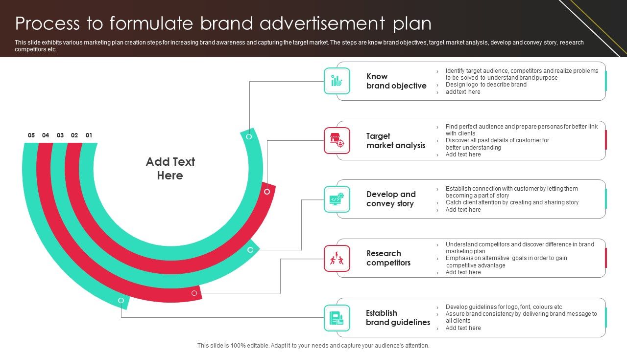 This slide exhibits various marketing plan creation steps for increasing brand awareness and capturing the target market. The steps are know brand objectives, target market analysis, develop and convey story, research competitors etc. Persuade your audience using this Process To Formulate Brand Advertisement Plan Ideas PDF. This PPT design covers five stages, thus making it a great tool to use. It also caters to a variety of topics including Target Market Analysis, Research Competitors, Brand Guidelines. Download this PPT design now to present a convincing pitch that not only emphasizes the topic but also showcases your presentation skills.