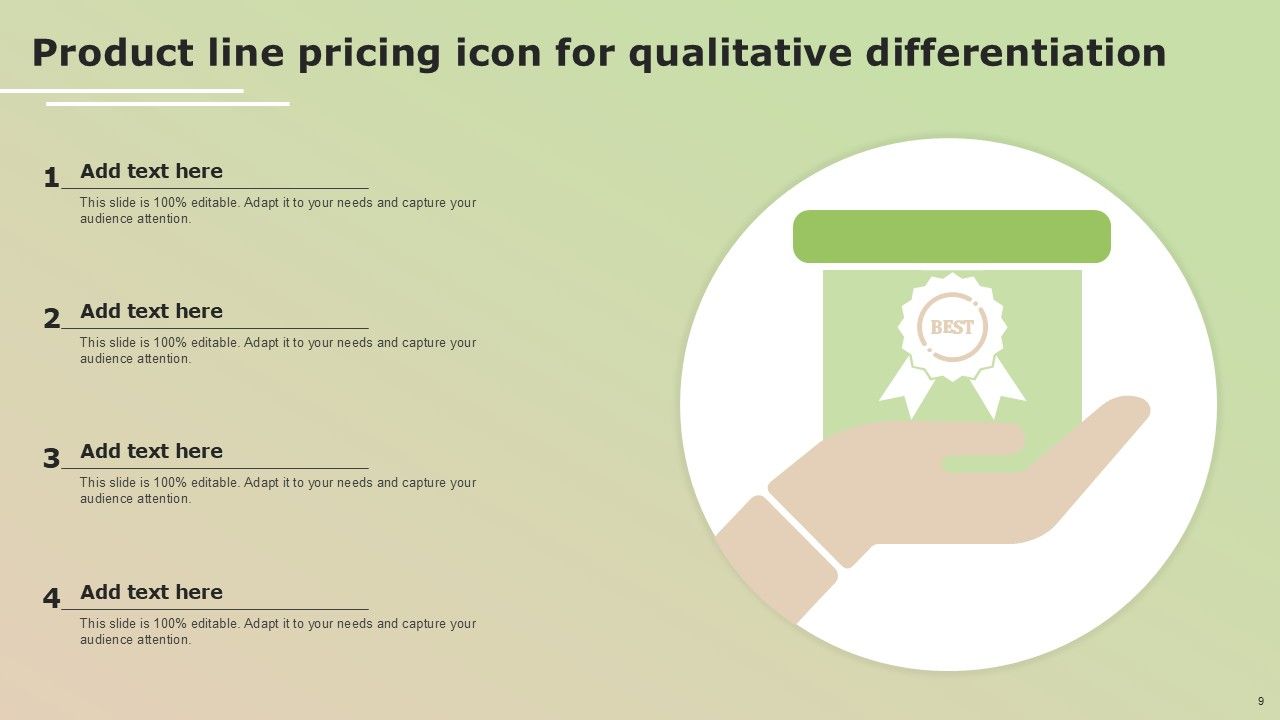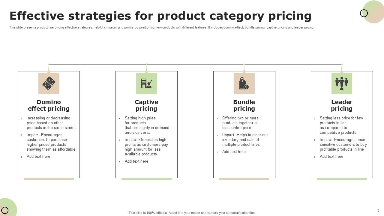 Improve your presentation delivery using this Product Category Pricing Ppt PowerPoint Presentation Complete Deck With Slides. Support your business vision and objectives using this well-structured PPT deck. This template offers a great starting point for delivering beautifully designed presentations on the topic of your choice. Comprising twelve this professionally designed template is all you need to host discussion and meetings with collaborators. Each slide is self-explanatory and equipped with high-quality graphics that can be adjusted to your needs. Therefore, you will face no difficulty in portraying your desired content using this PPT slideshow. This PowerPoint slideshow contains every important element that you need for a great pitch. It is not only editable but also available for immediate download and utilization. The color, font size, background, shapes everything can be modified to create your unique presentation layout. Therefore, download it now.