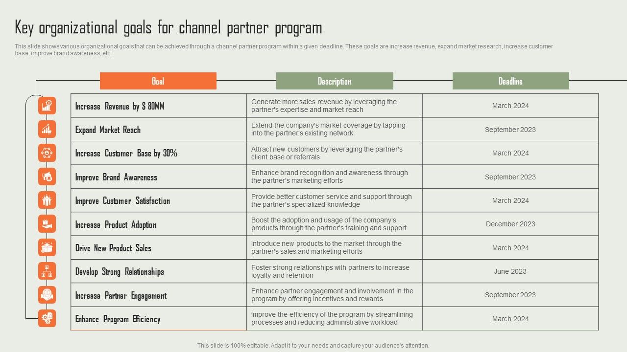 This slide shows various organizational goals that can be achieved through a channel partner program within a given deadline. These goals are increase revenue, expand market research, increase customer base, improve brand awareness, etc. Explore a selection of the finest Product Marketing And Sales Expansion Through Channel Key Organizational Goals For Channel Partner Program Download PDF here. With a plethora of professionally designed and pre made slide templates, you can quickly and easily find the right one for your upcoming presentation. You can use our Product Marketing And Sales Expansion Through Channel Key Organizational Goals For Channel Partner Program Download PDF to effectively convey your message to a wider audience. Slidegeeks has done a lot of research before preparing these presentation templates. The content can be personalized and the slides are highly editable. Grab templates today from Slidegeeks.