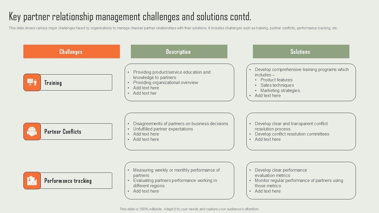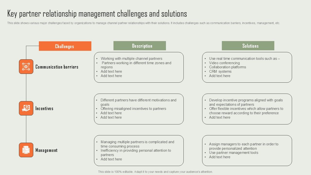 This slide shows various major challenges faced by organizations to manage channel partner relationships with their solutions. It includes challenges such as communication barriers, incentives, management, etc. The best PPT templates are a great way to save time, energy, and resources. Slidegeeks have 100 percent editable powerpoint slides making them incredibly versatile. With these quality presentation templates, you can create a captivating and memorable presentation by combining visually appealing slides and effectively communicating your message. Download Product Marketing And Sales Expansion Through Channel Key Partner Relationship Management Challenges Introduction PDF from Slidegeeks and deliver a wonderful presentation.