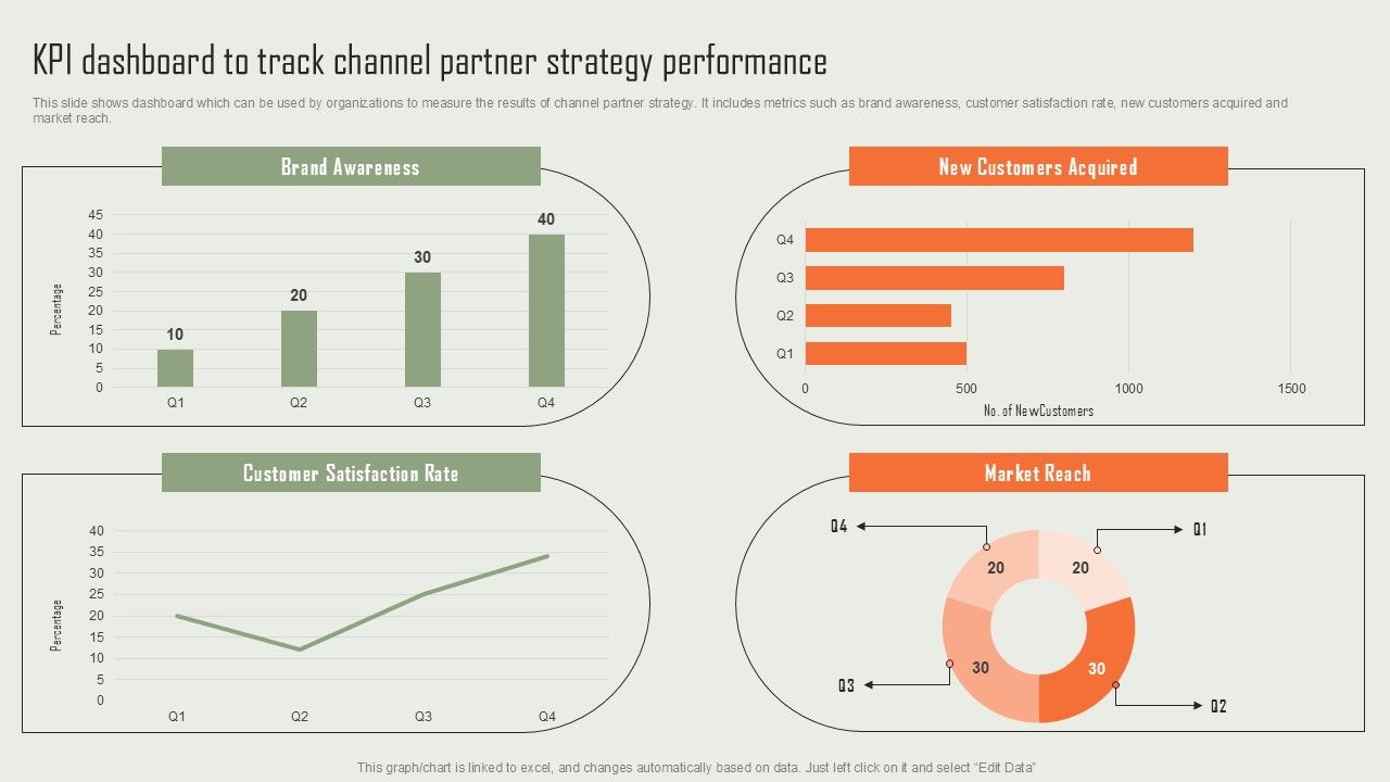 This slide shows dashboard which can be used by organizations to measure the results of channel partner strategy. It includes metrics such as brand awareness, customer satisfaction rate, new customers acquired and market reach. Are you searching for a Product Marketing And Sales Expansion Through Channel KPI Dashboard To Track Channel Partner Strategy Diagrams PDF that is uncluttered, straightforward, and original Its easy to edit, and you can change the colors to suit your personal or business branding. For a presentation that expresses how much effort you have put in, this template is ideal. With all of its features, including tables, diagrams, statistics, and lists, its perfect for a business plan presentation. Make your ideas more appealing with these professional slides. Download Product Marketing And Sales Expansion Through Channel KPI Dashboard To Track Channel Partner Strategy Diagrams PDF from Slidegeeks today.