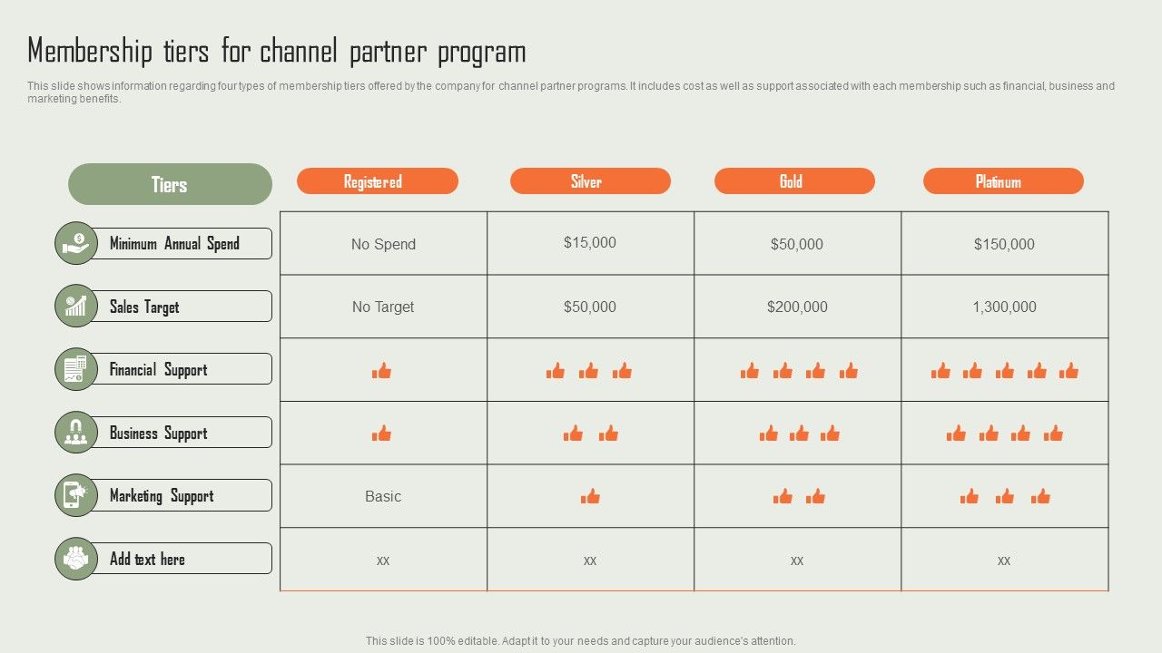 This slide shows information regarding four types of membership tiers offered by the company for channel partner programs. It includes cost as well as support associated with each membership such as financial, business and marketing benefits. Slidegeeks has constructed Product Marketing And Sales Expansion Through Channel Membership Tiers For Channel Partner Program Microsoft PDF after conducting extensive research and examination. These presentation templates are constantly being generated and modified based on user preferences and critiques from editors. Here, you will find the most attractive templates for a range of purposes while taking into account ratings and remarks from users regarding the content. This is an excellent jumping off point to explore our content and will give new users an insight into our top notch PowerPoint Templates.