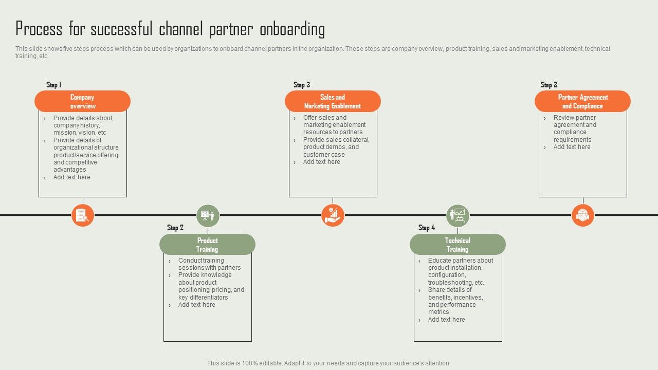 This slide shows five steps process which can be used by organizations to onboard channel partners in the organization. These steps are company overview, product training, sales and marketing enablement, technical training, etc. Here you can discover an assortment of the finest PowerPoint and Google Slides templates. With these templates, you can create presentations for a variety of purposes while simultaneously providing your audience with an eye catching visual experience. Download Product Marketing And Sales Expansion Through Channel Process For Successful Channel Partner Onboarding Mockup PDF to deliver an impeccable presentation. These templates will make your job of preparing presentations much quicker, yet still, maintain a high level of quality. Slidegeeks has experienced researchers who prepare these templates and write high quality content for you. Later on, you can personalize the content by editing the Product Marketing And Sales Expansion Through Channel Process For Successful Channel Partner Onboarding Mockup PDF.