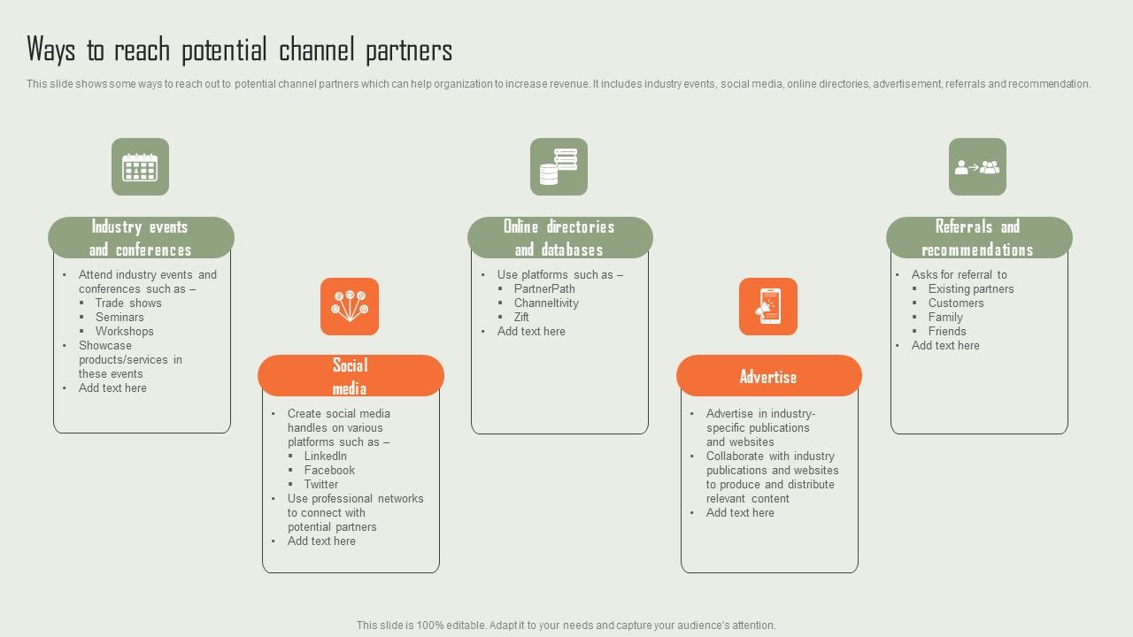 Product Marketing And Sales Expansion Through Channel Ways To Reach Potential Channel Partners Themes PDF with all 9 slides: