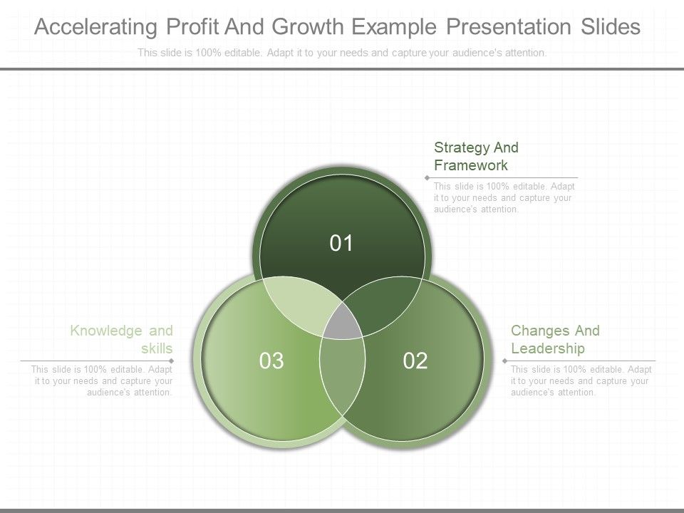 This is a accelerating profit and growth example presentation slides. This is a three stage process. The stages in this process are strategy and framework, changes and leadership, knowledge and skill.