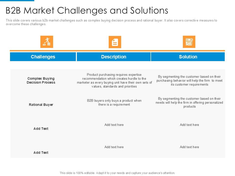 Deliver and pitch your topic in the best possible manner with this b2b market challenges and solutions summary pdf. Use them to share invaluable insights on challenges, description, solution and impress your audience. This template can be altered and modified as per your expectations. So, grab it now.