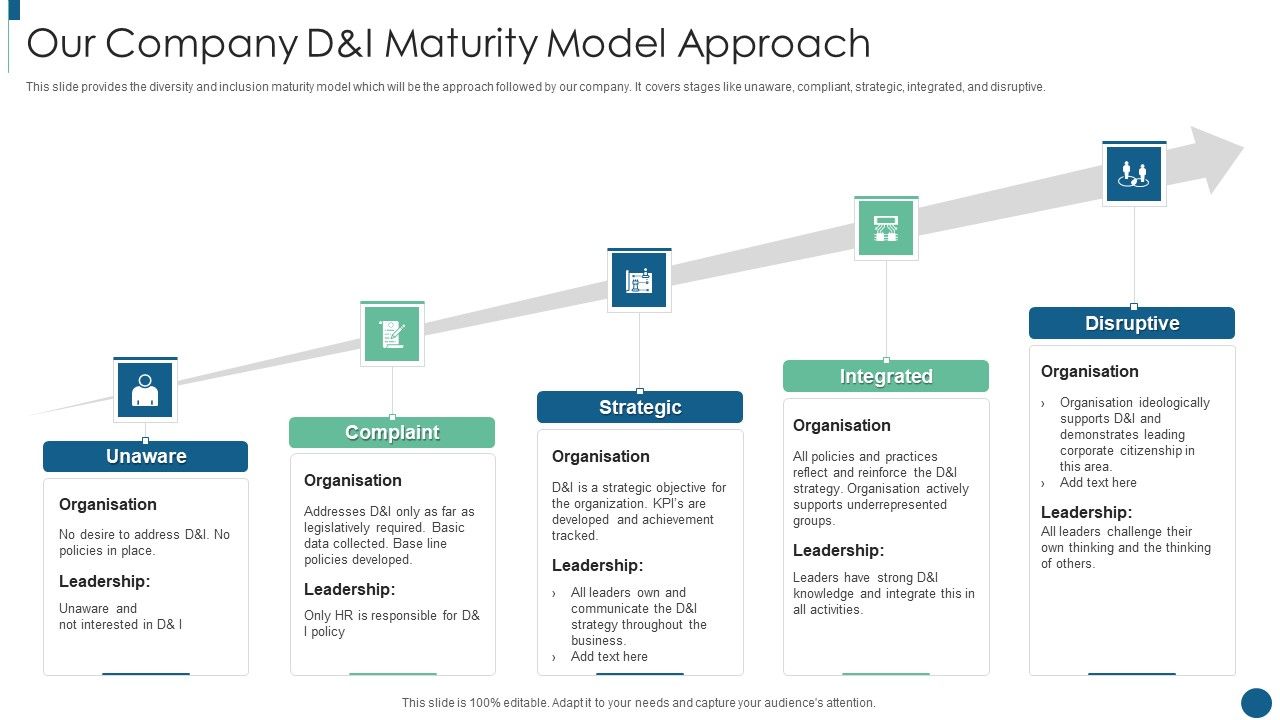 This slide provides the diversity and inclusion maturity model which will be the approach followed by our company. It covers stages like unaware, compliant, strategic, integrated, and disruptive. This is a Developing Inclusive And Diversified Our Company Dandi Maturity Model Approach Structure PDF template with various stages. Focus and dispense information on five stages using this creative set, that comes with editable features. It contains large content boxes to add your information on topics like Unaware, Complaint, Strategic, Integrated, Disruptive. You can also showcase facts, figures, and other relevant content using this PPT layout. Grab it now.