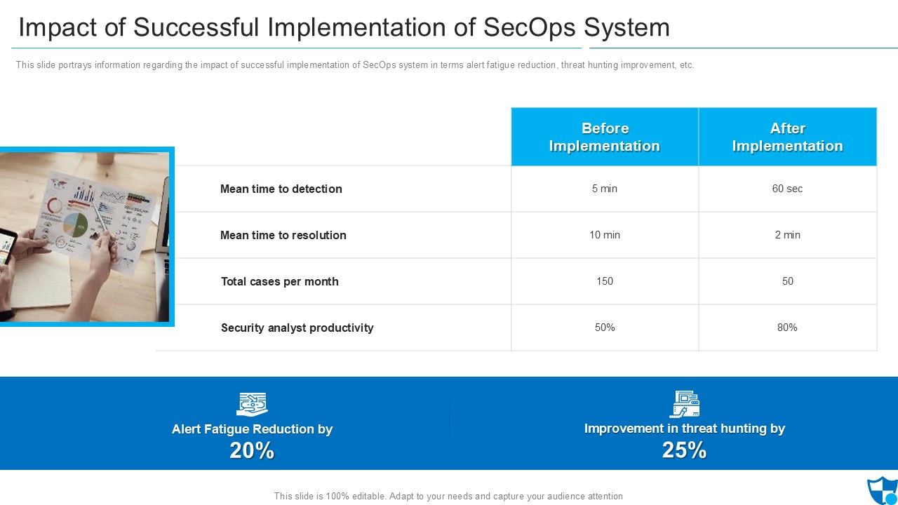 This slide portrays information regarding the impact of successful implementation of SecOps system in terms alert fatigue reduction, threat hunting improvement, etc. This is a impact of successful implementation of secops system designs pdf template with various stages. Focus and dispense information on two stages using this creative set, that comes with editable features. It contains large content boxes to add your information on topics like before implementation, total cases per month, security analyst productivity . You can also showcase facts, figures, and other relevant content using this PPT layout. Grab it now.
